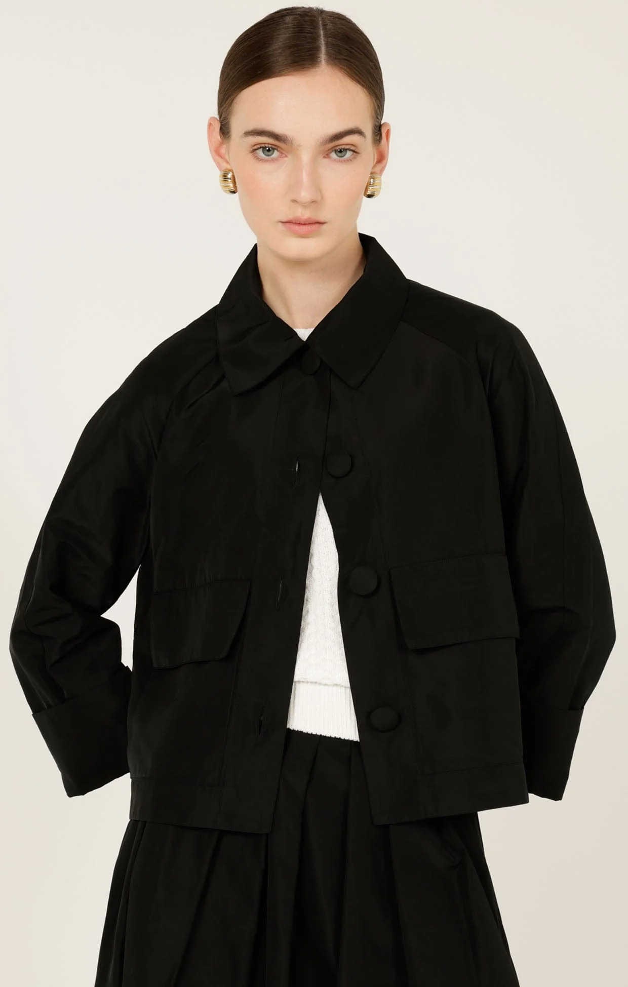 Stylish and versatile, the Button-Up Cropped Jacket is made from lightweight, water-resistant memory taffeta in a relaxed silhouette. Finished with statement self-fabric buttons, a double-layered back, and foldable sleeves, it’s a layering piece perfect for travel, work, and weekends.