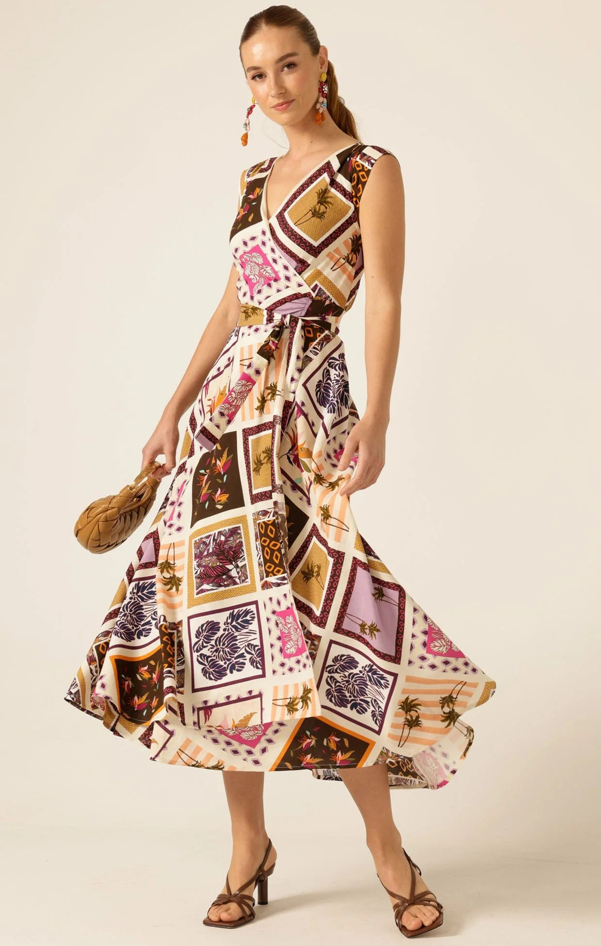 The Sunset Chase Wrap Dress is made from a luxurious, lightweight viscose-linen and features a vibrant tile print exclusive to SACHA DRAKE. It features our iconic wrap design, detachable belt buckle, flared A-line silhouette, cream-edged bodice, and midi-length skirt.